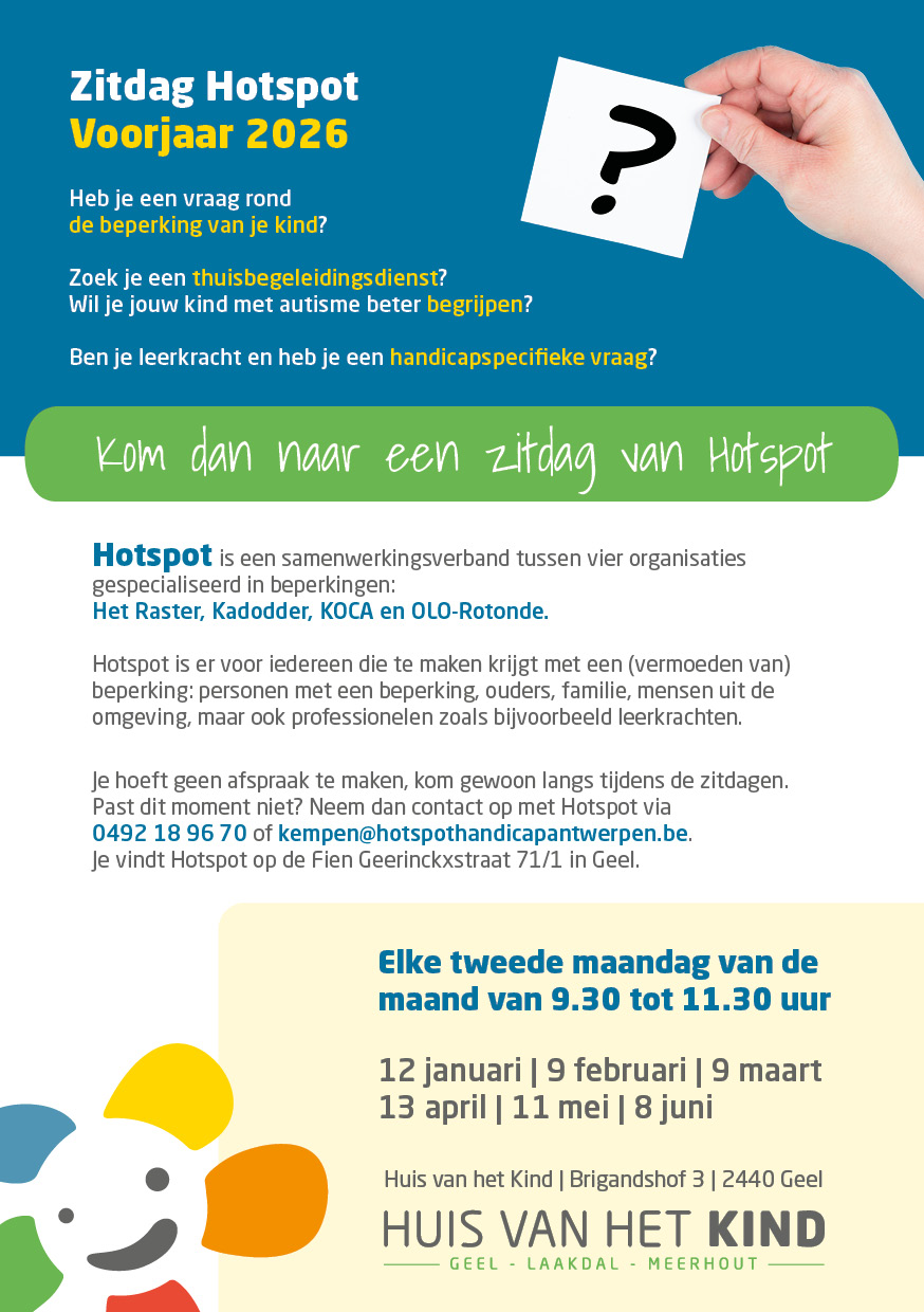 Zitdag HOTSPOT Heb je een vraag rond de beperking van je kind? Zoek je een thuisbegeleidingsdienst? Wil je jouw kind met autisme beter begrijpen? Zoek je hulp bij het aanvragen van een budget bij de FOD Financiën? Ben je leerkracht en heb je een specifieke vraag?